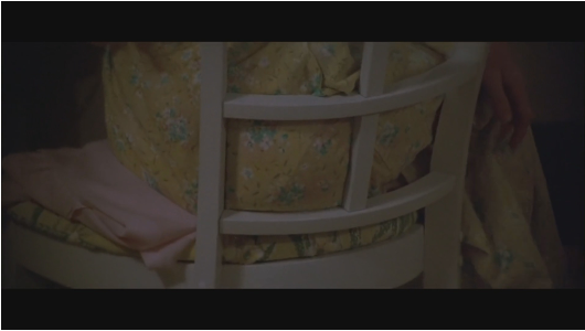 The scene starts with brilliant cinematography showing Pinky putting on a yellow nightgown before starting to sew. Pinky takes the key to Millie’s diary and begins to read it, desperately fumbling with the book. Pinky then walks off camera to the nearby desk while the camera lingers on Millie’s bed where Pinky discarded the key. There is a hard cut jumping to Millie returning home and when inside; the camera’s location rarely ever changes from its spot at the end of the bedroom. This could be because Altman wanted to give the impression that the audience is in Pinky’s shoes. We are watching Millie run in and out of the bedroom, which indirectly creates tension since the bedroom is almost ‘contaminated’ with evidence of Pinky’s wrongdoings.